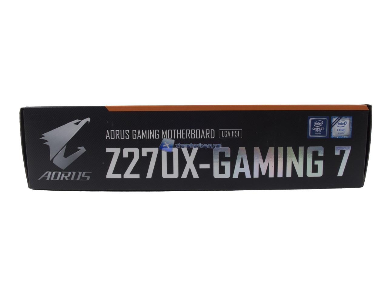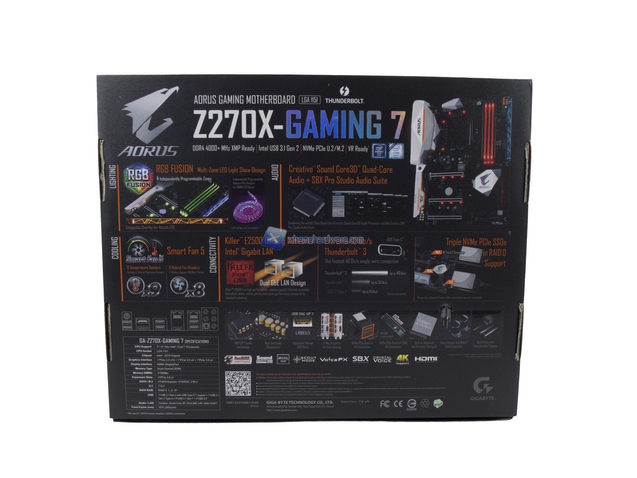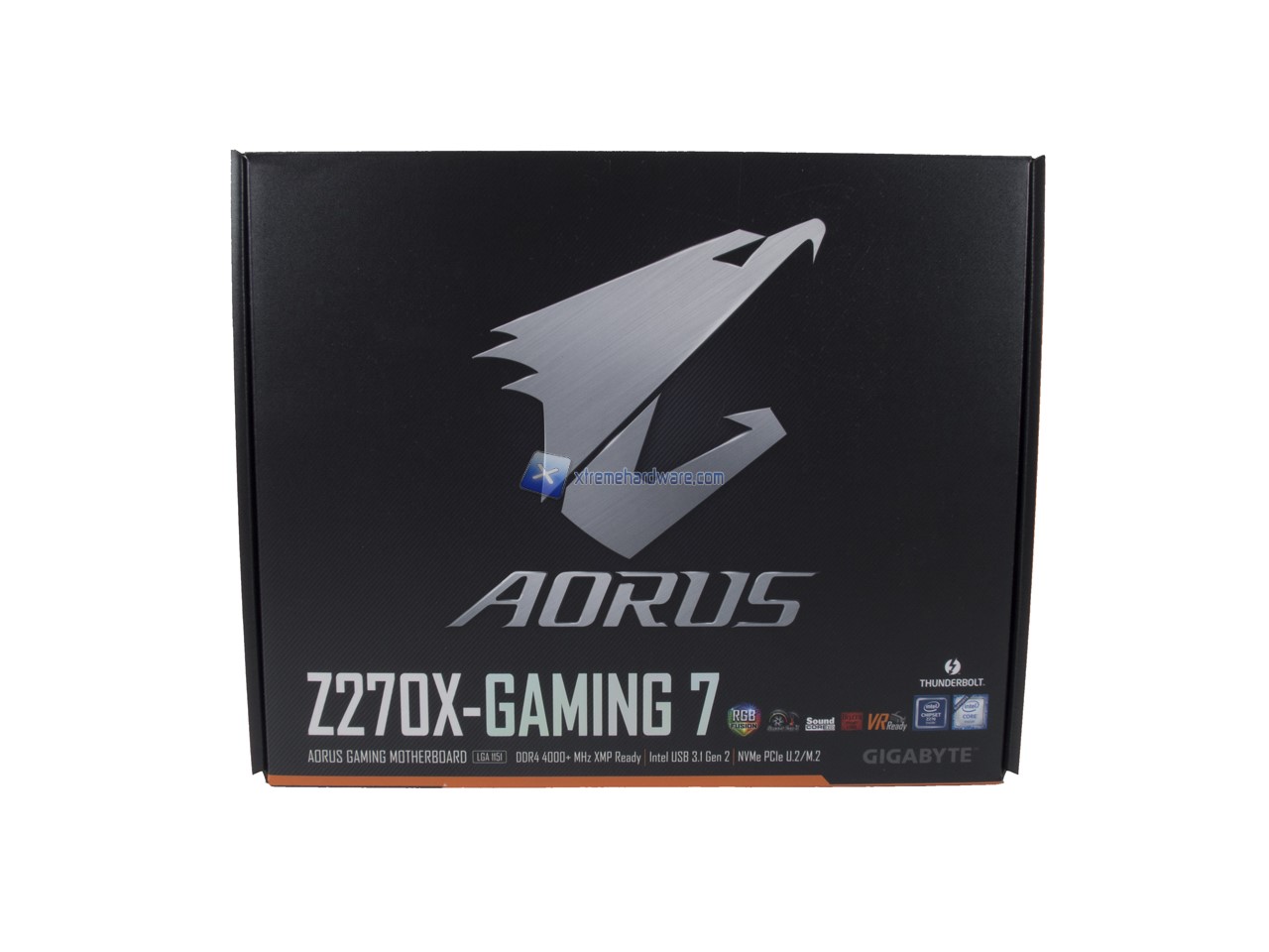 La confezione della GIGABYTE AORUS Z270X-Gaming 7 è sempre realizzata in cartone ed adotta il nuovo design della serie AORUS. Troveremo su uno sfondo nero il nuovo logo AORUS, raffigurante il braccio ed il volto di un’aquila, troviamo altresì altre informazioni. Il retro si caratterizza sempre per la descrizione di alcune delle principali caratteristiche.