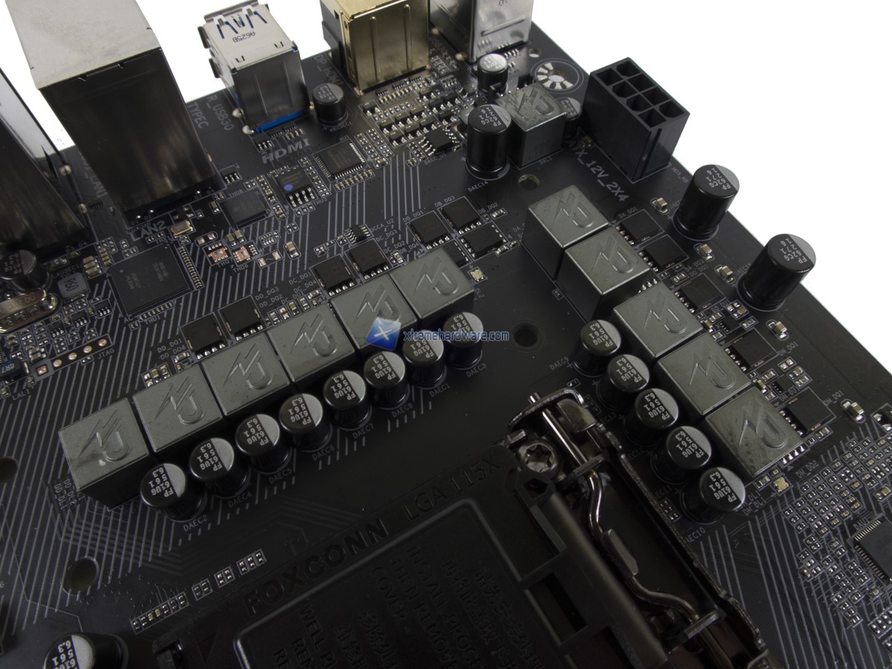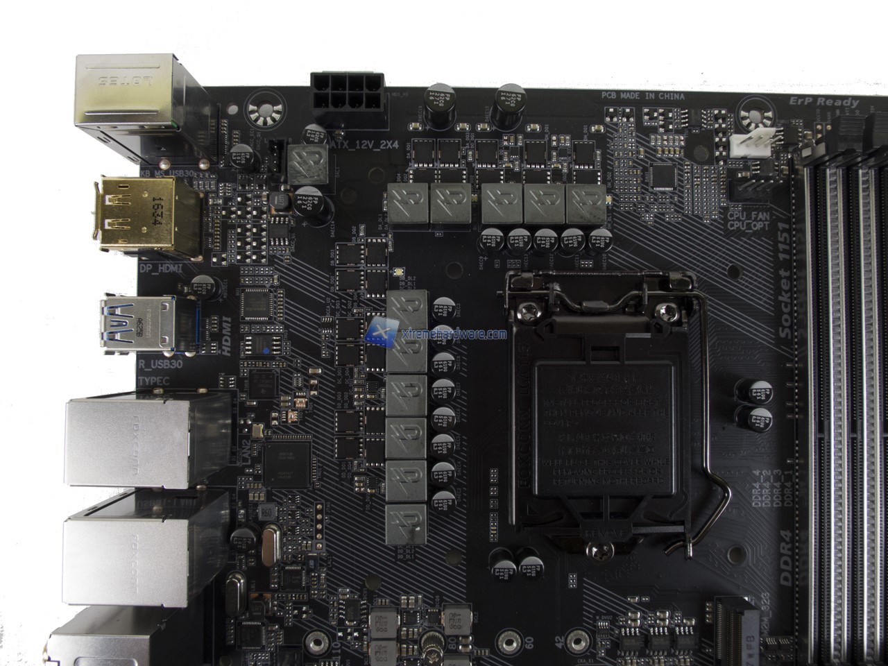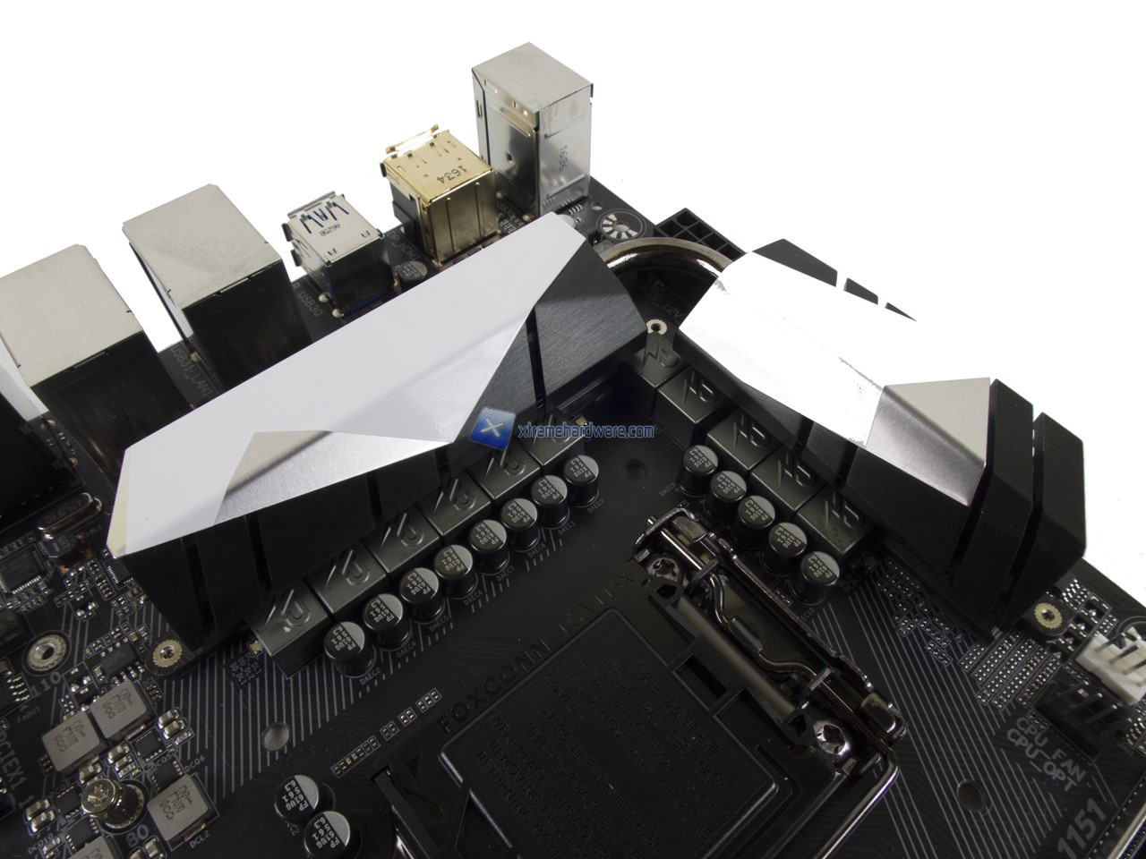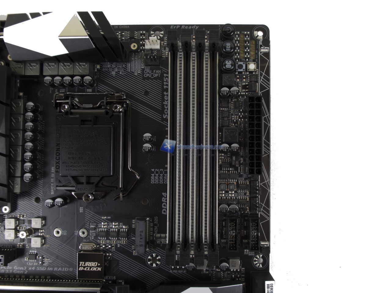 Ci fiondiamo subito alla zona socket dove troviamo i consueti dissipatori in alluminio di medie dimensioni uniti tra di loro da una singola heatpipe in rame nickelato. Il design segue uniformemente quello della scheda madre nella sua completezza.