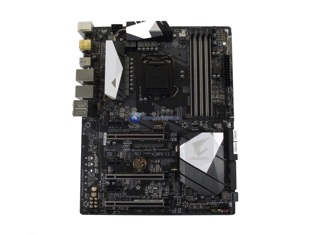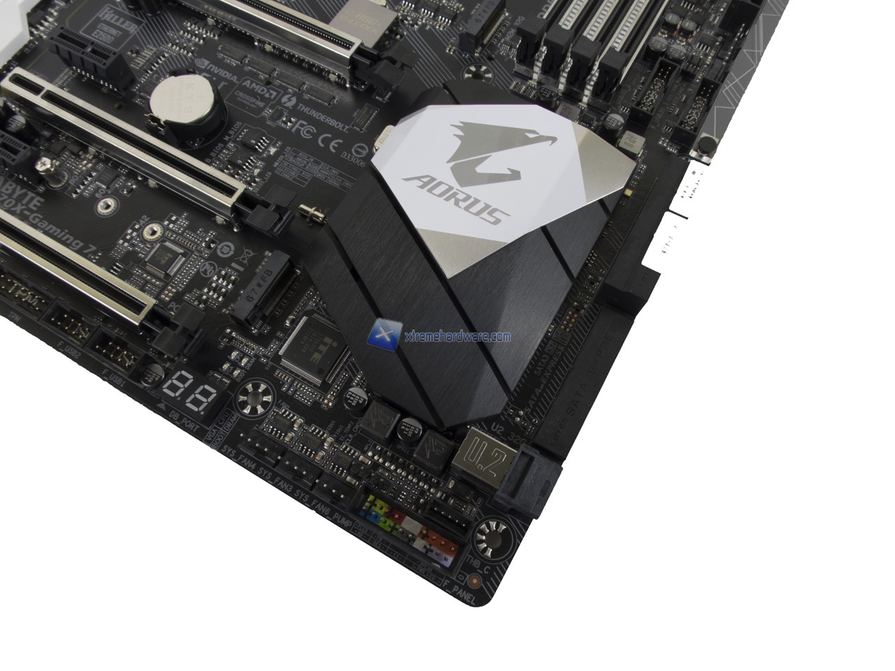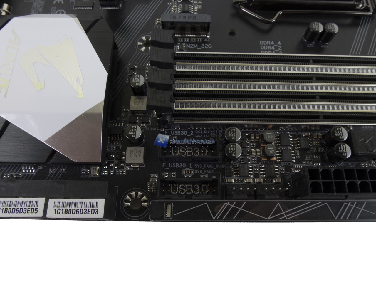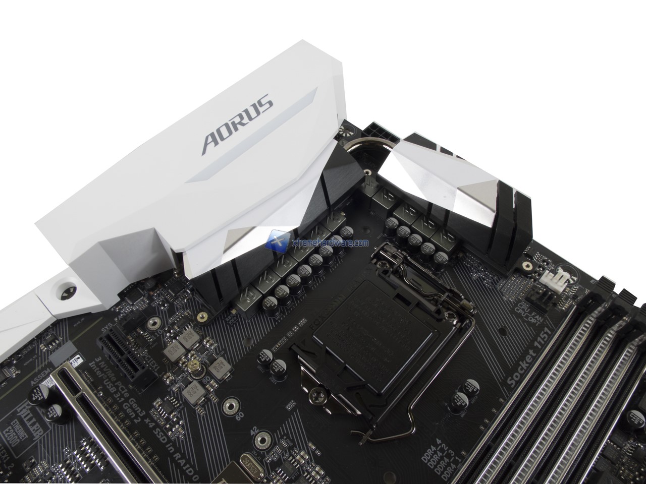 Posizionandoci dall’alto possiamo osservare il generoso heatsink in alluminio con logo AORUS a dissipare il PCH Z270.