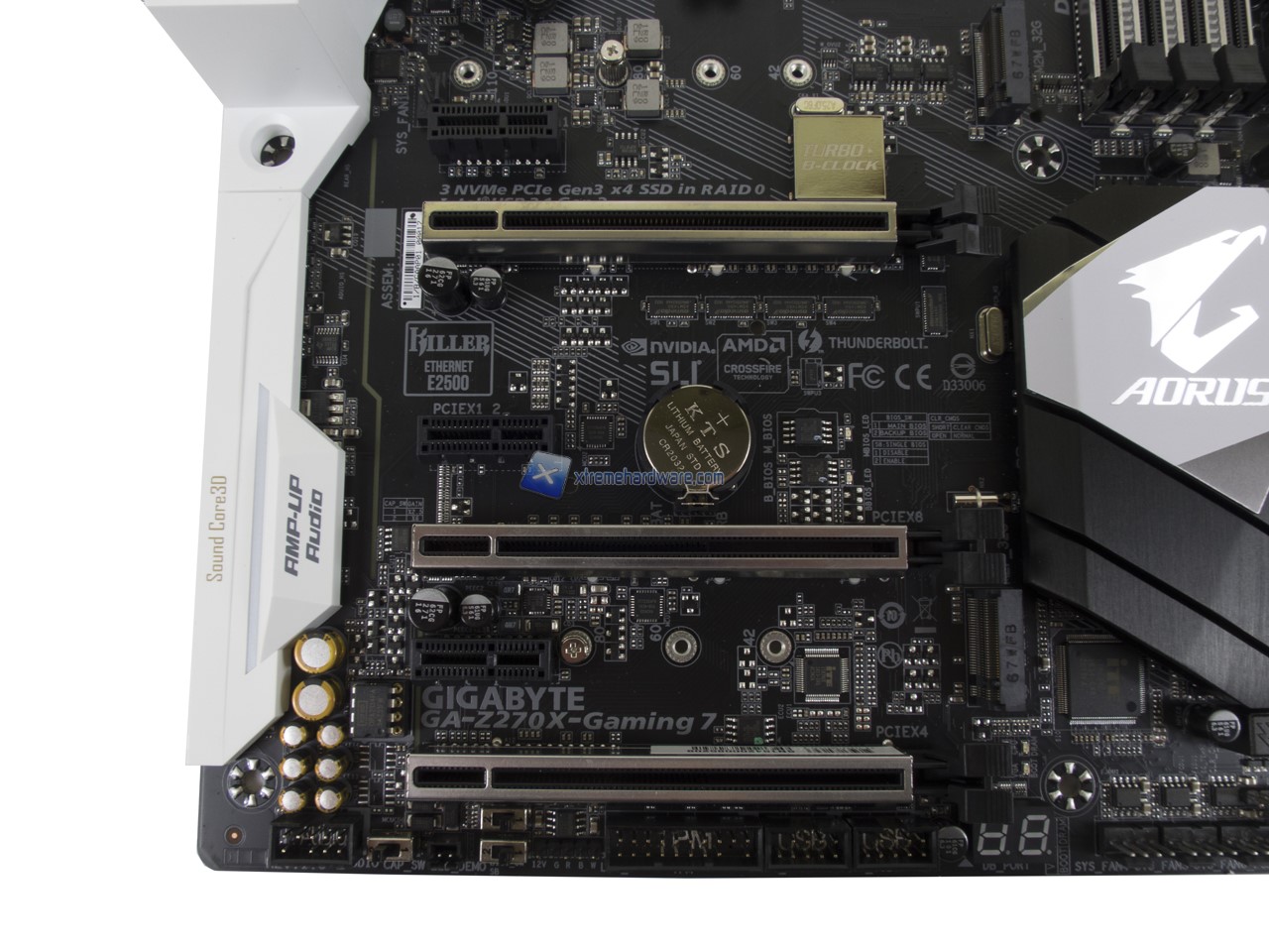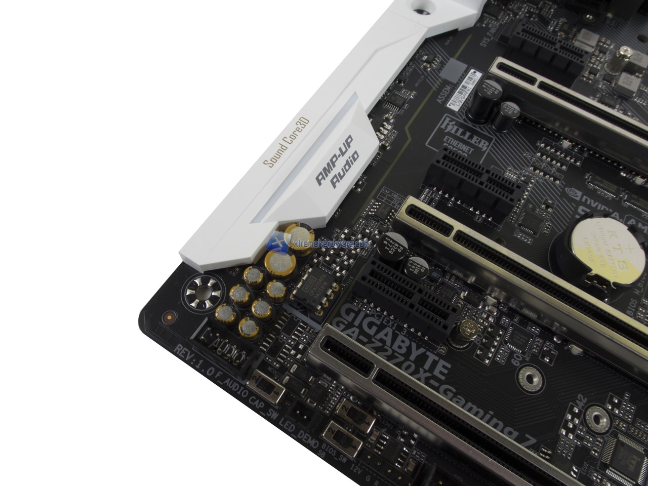 Siamo così giunti nel lato sinistro dove troviamo la cover che proteggerà il circuito Audio dedicato. Come vediamo per la AORUS Z270X-Gaming 7 troviamo un circuito fornito da Sound Blaster e precisamente Sound Core3D. Un pacchetto Hardware e Software con relativo OP-AMP.