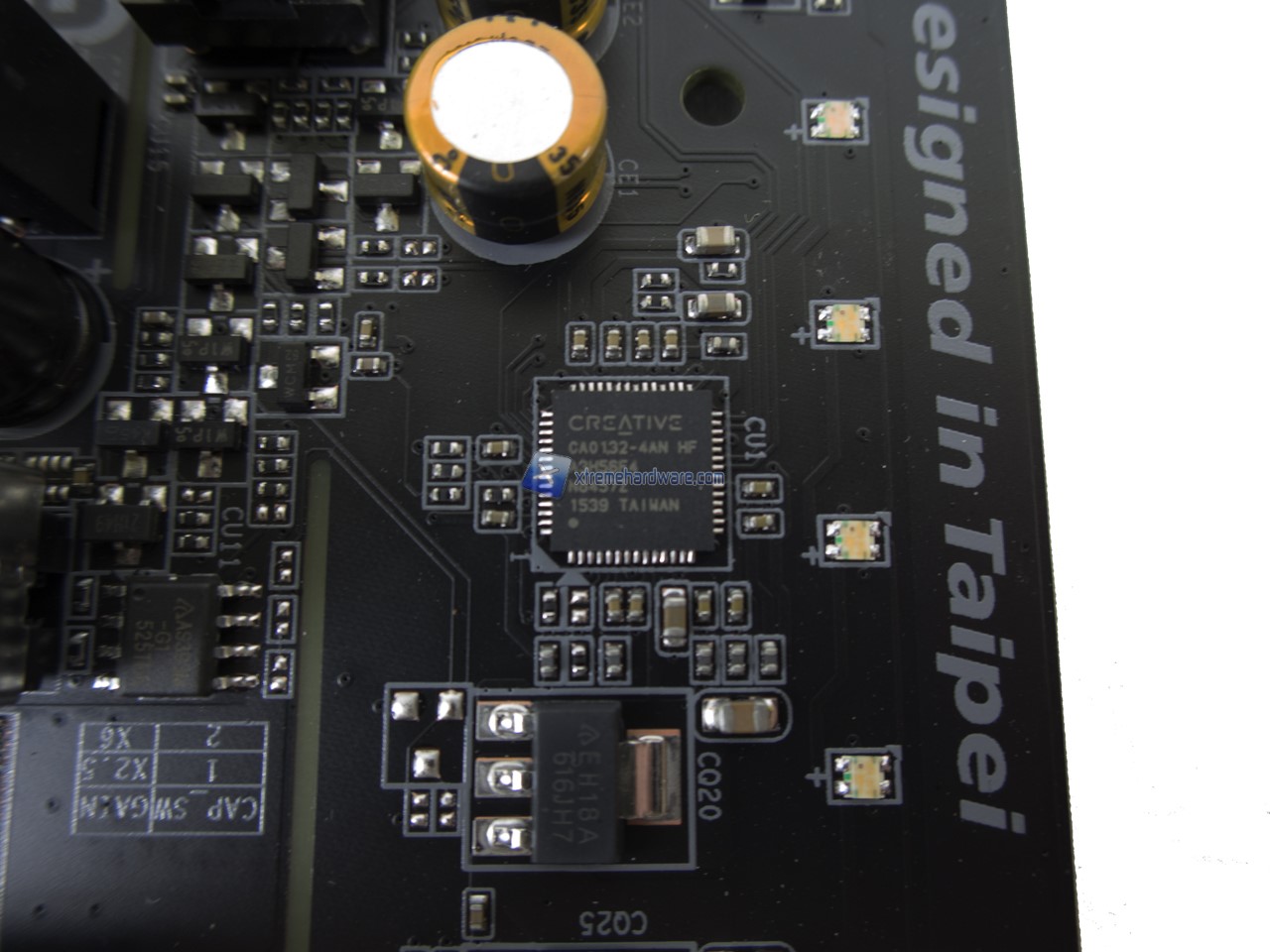 Rimossa la cover possiamo osservare non solo il Trace Path con LED ma anche gli 8 condensatori Nichicon Gold, l’OP-AMP Burr-Brown OPA2134 e il chip Audio dedicato Creative Core3Di CA0132 Quad-Core. Vedremo il dettaglio del Chip a seguire.