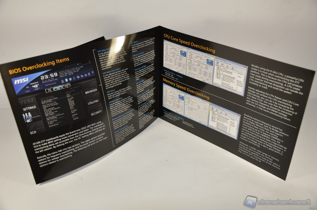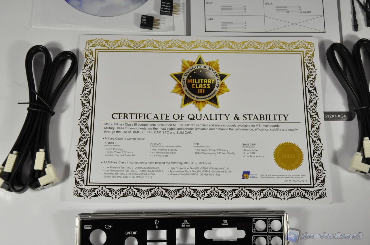A garanzia del livello qualitativo svolto dagli ingegneri in fase di progettazione e di realizzazione troviamo nel bundle il Certificato di Qualità e Stabilità, cosa molto apprezzata e che pochi altri produttori offrono. Oltre a 4 cavi SATA e alla classica mascherina, è presente un Bridge per lo SLI. Per il resto il bundle è molto essenziale.