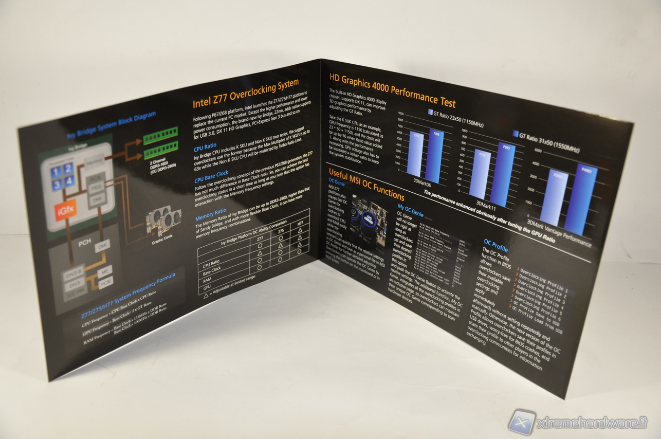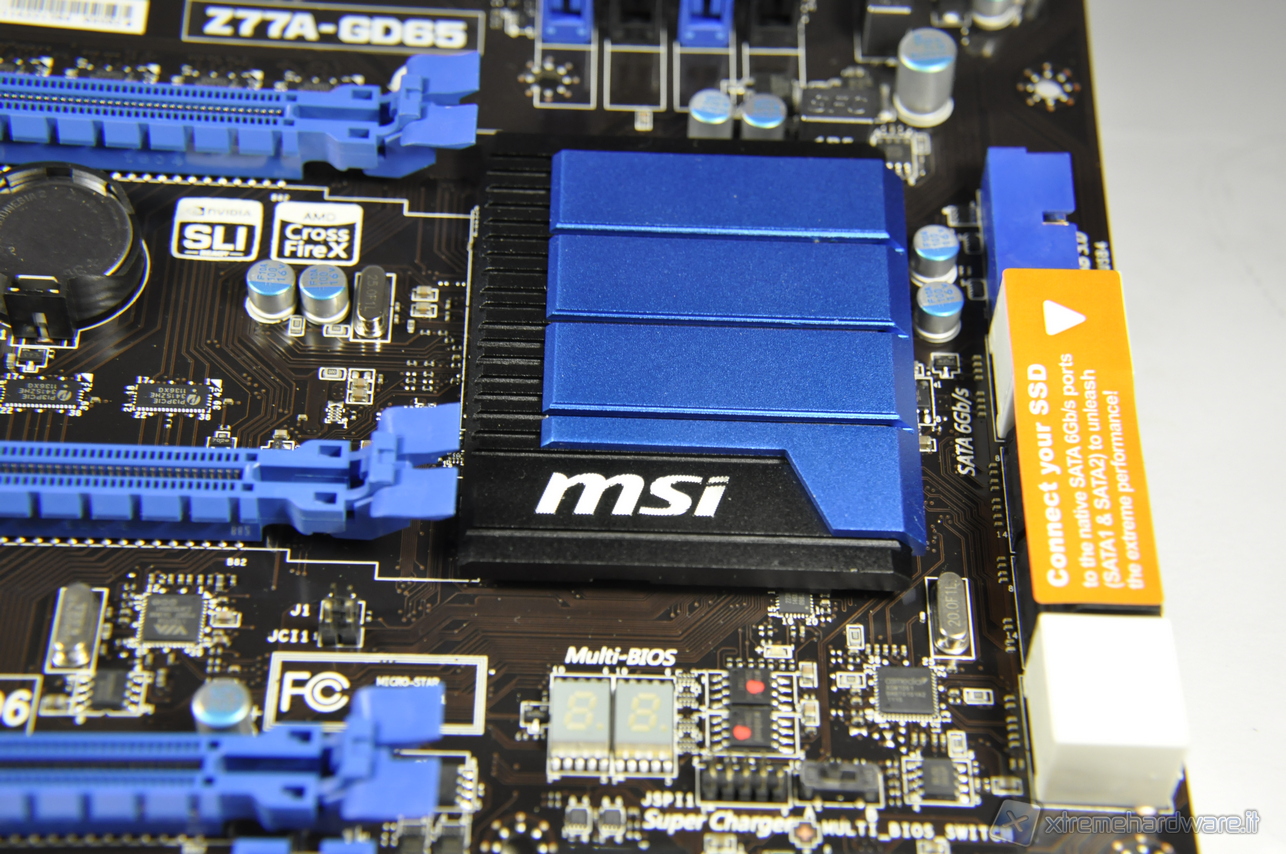 Il dissipatore in primo piano del chipset Z77 è più per bellezza che per vera funzionalità di dissipazione, dato che le funzioni principali e più impegnative, come il controller della memoria oppure il controller PCI-Express sono state integrate nel processore.