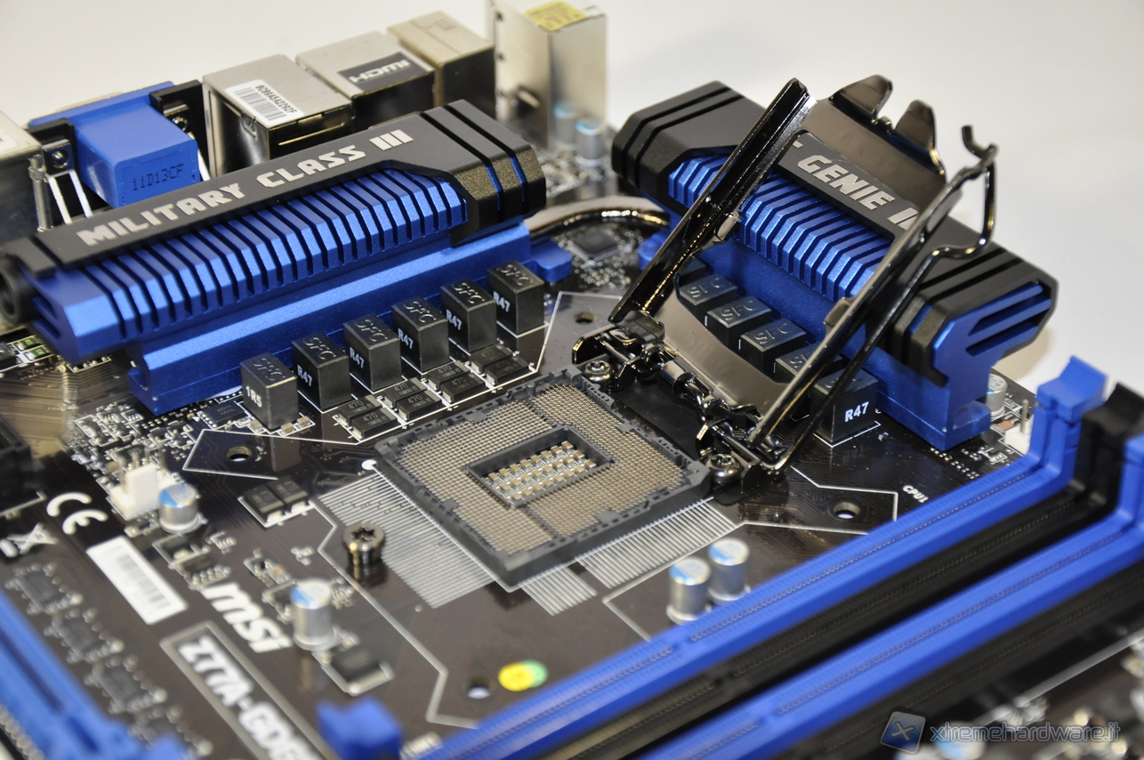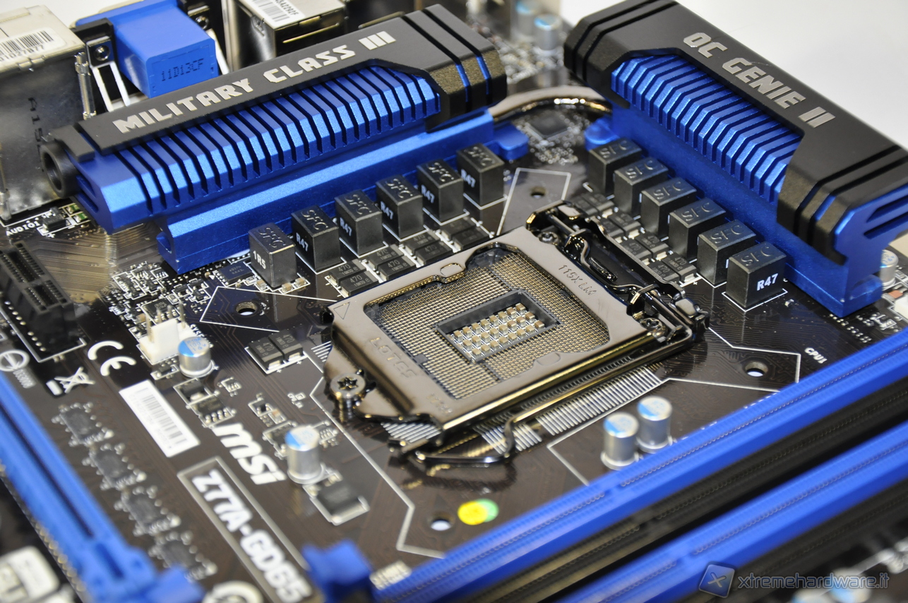 La zona del socket è molto curata: i generosi dissipatori della sezione di alimentazione, uniti da una heatpipe, nascondono i DrMOS II, punto forte delle serie di schede madri Military Class III. Davanti ad essi spiccano le induttanze Super Ferrite Chokes, ai cui piedi, adagiati sul PCB si trovano i condensatori Hi-C Cap al tantalio. 8 le fasi per la CPU (VCC), 2 per il memory controller (VSA), 1 per il VTT e 1 per la IGP (VAXG.)