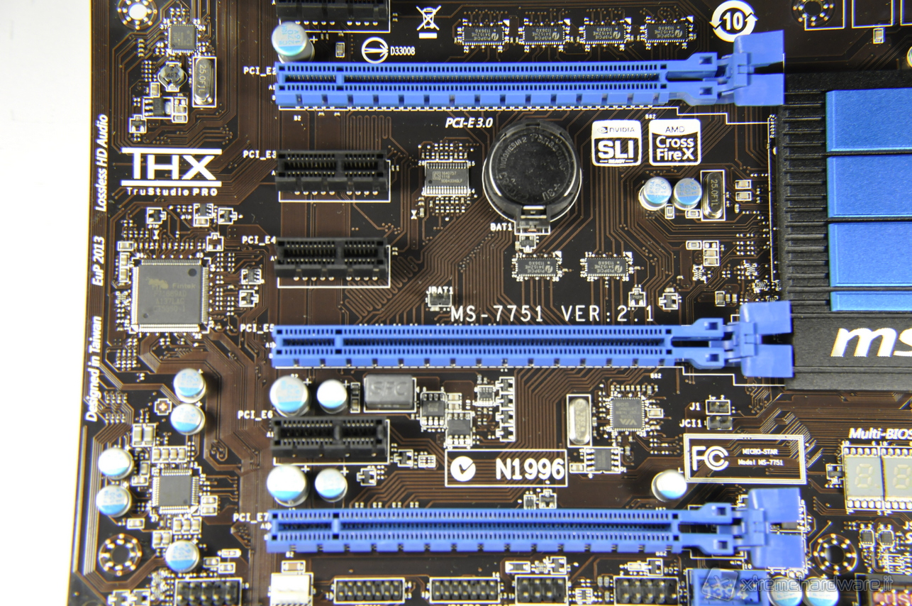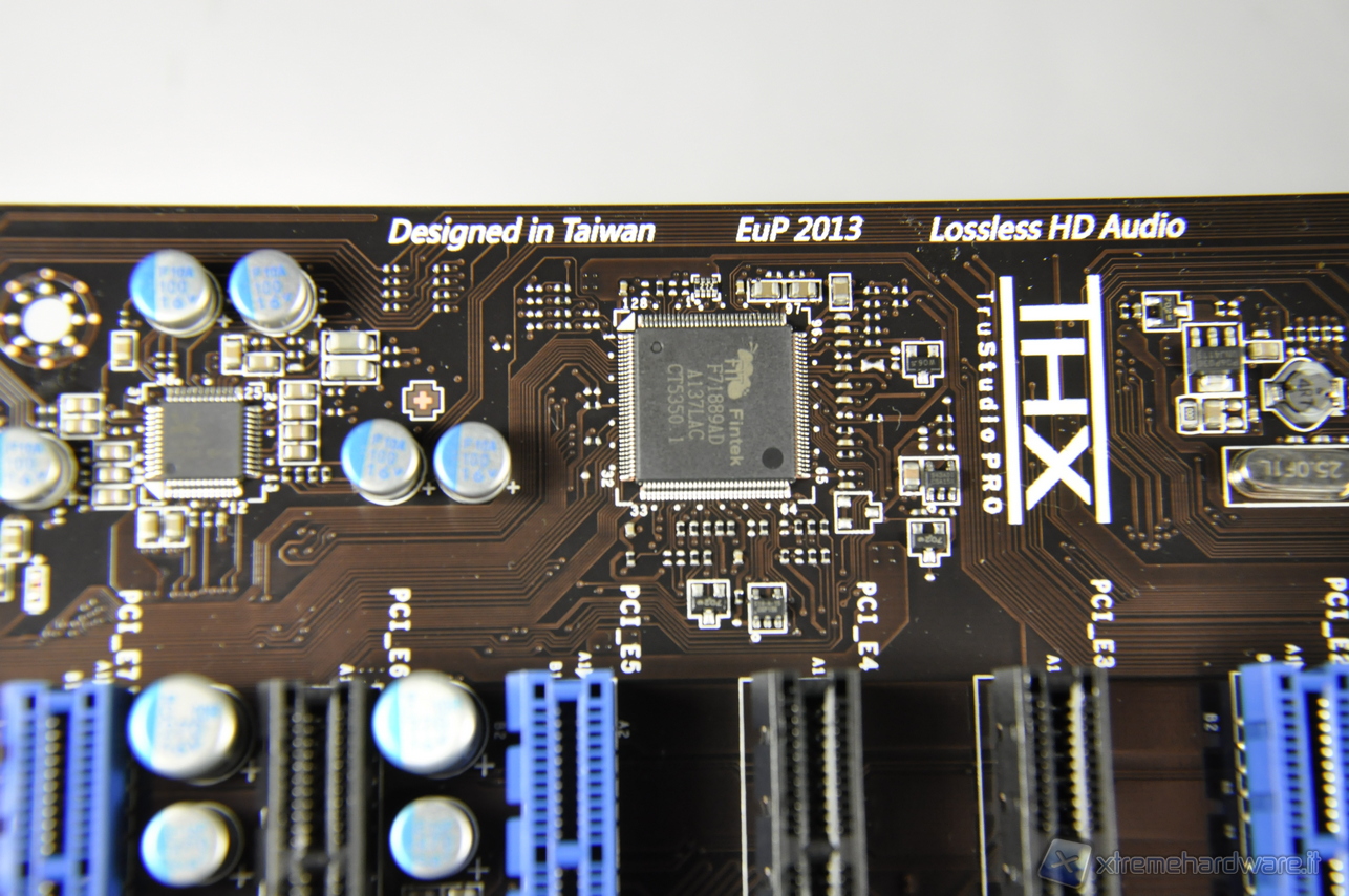 Gli slot PCI-Express si dividono per tipologia e quindi per colore. In nero sono quelli PCI-Express con velocità x1 mentre in blu sono quelli a piena lunghezza, meccanicamente compatibili con lo standard PCI-Express 3.0 e velocità x16 e configurabili rispettivamente in modalità x16, x8, x4, come si può anche notare da una attenta analisi delle piste sul PCB.