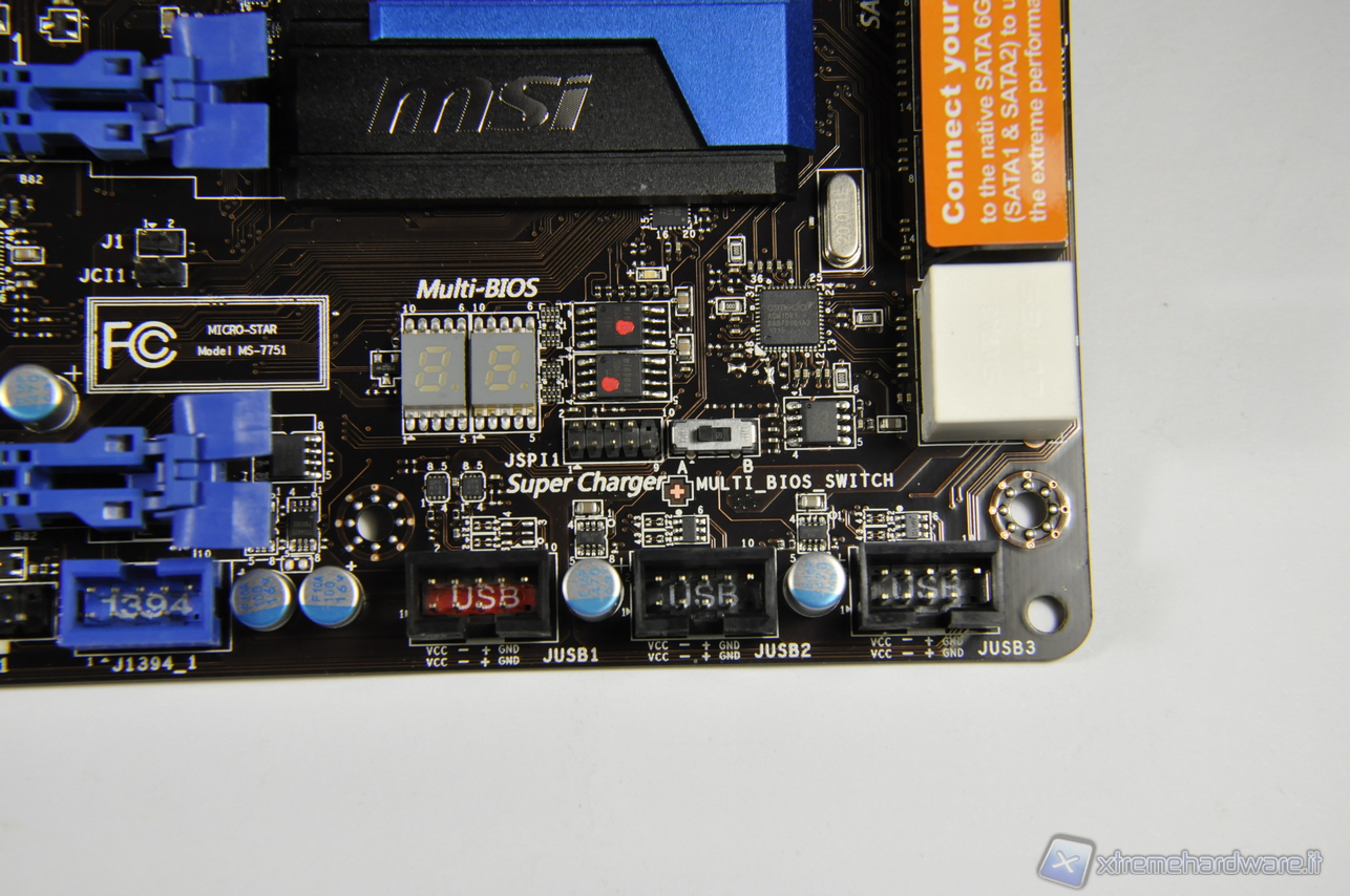 Altra feature decisamente interessante: troviamo il micro switch per la selezione ed il conseguente boot dal primo o dal secondo BIOS, mentre risulta utilissimo in fase diagnostica il display a 2 cifre.