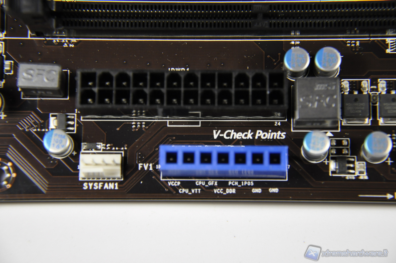 Una delle peculiarità che ritroviamo sulla Z77A-GD65, come sulle precedenti motherboard del produttore MSI di fascia alta, è la disponibilità di rilevare le singole tensioni a mezzo di un multimetro e quindi conoscere in tempo reale qual è il voltaggio erogato a quella data sezione. Gli overclockers sanno bene come sia utilissima questa funzionalità specie durante sessione di Overclock spinto con parametri fuori specifica, ben oltre i limiti imposti da Intel. Le tensioni rilevabili sono chiaramente serigrafate sul PCB della motherboard.