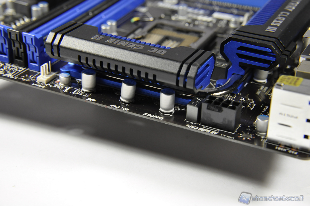 Per finire, il primo piano dei dissipatori della zona socket uniti da una Heat pipe e importante, il connettore di alimentazione ad 8 PIN ormai d’obbligo data la potenza assorbita dai processori di ultima generazione in fase di overclock.